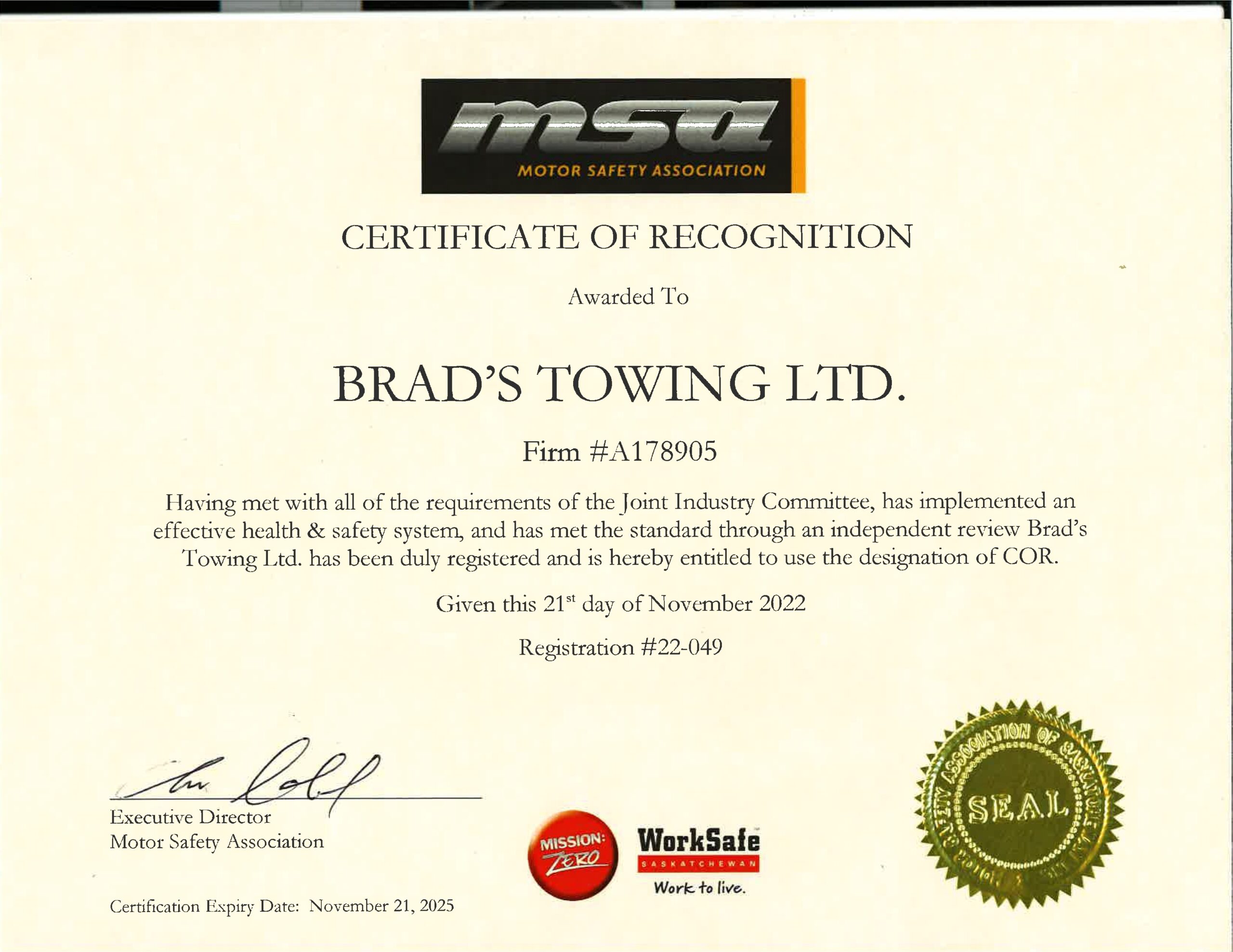 Downloads Certificate of Liability Insurance Certificate of Safety Fitness Mission Zero Partnership Agreement City of Saskatoon Business Licesnse ISNetworld Certificate WCB Letter MSA Certificate US Profile RRA Membership